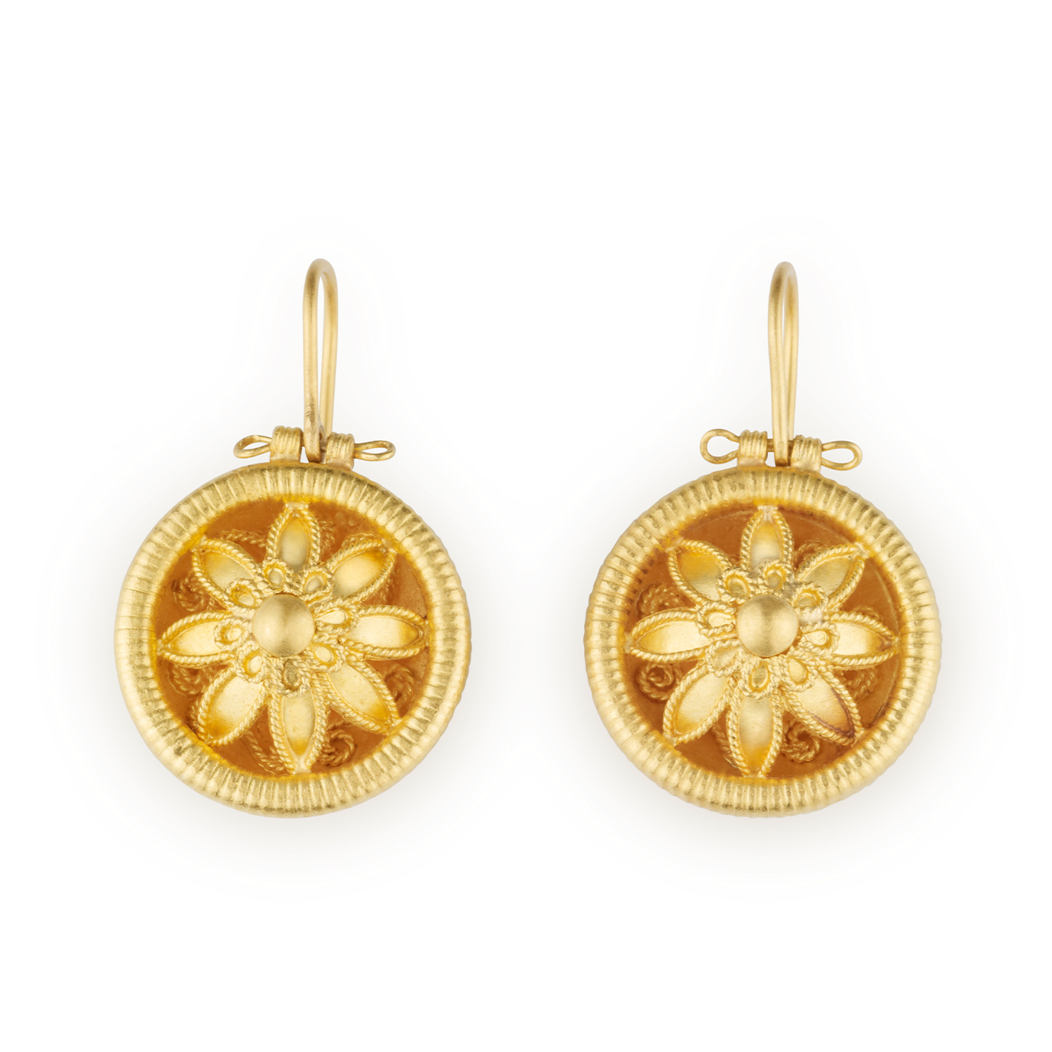 SPECIFICATION: Completely Handcrafted 24 Karat Pure Gold Pinned Earrings Decorated with Ancient Hellenistic Rosettes.