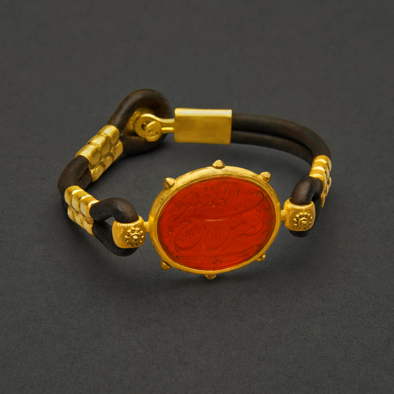Completely Handcrafted 24 Karat Pure Gold Leather Bracelet with Agate Stamp