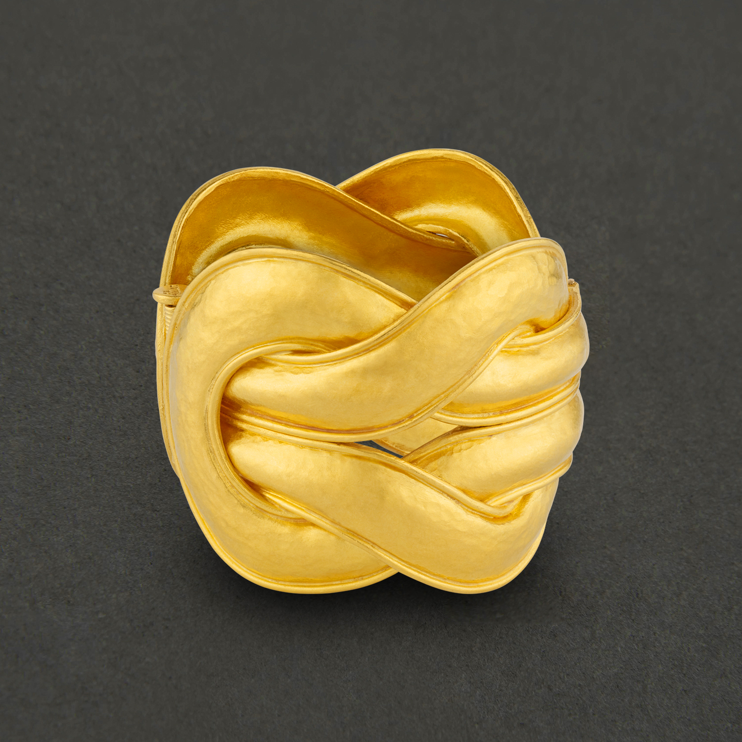The Heracles knot, an enduring symbol of commitment, defines this iconic piece. Crafted in two 24 Karat gold halves and shaped with intricate hand hammering, the two pieces are joined together to form the signature knot and handcrafted lock.