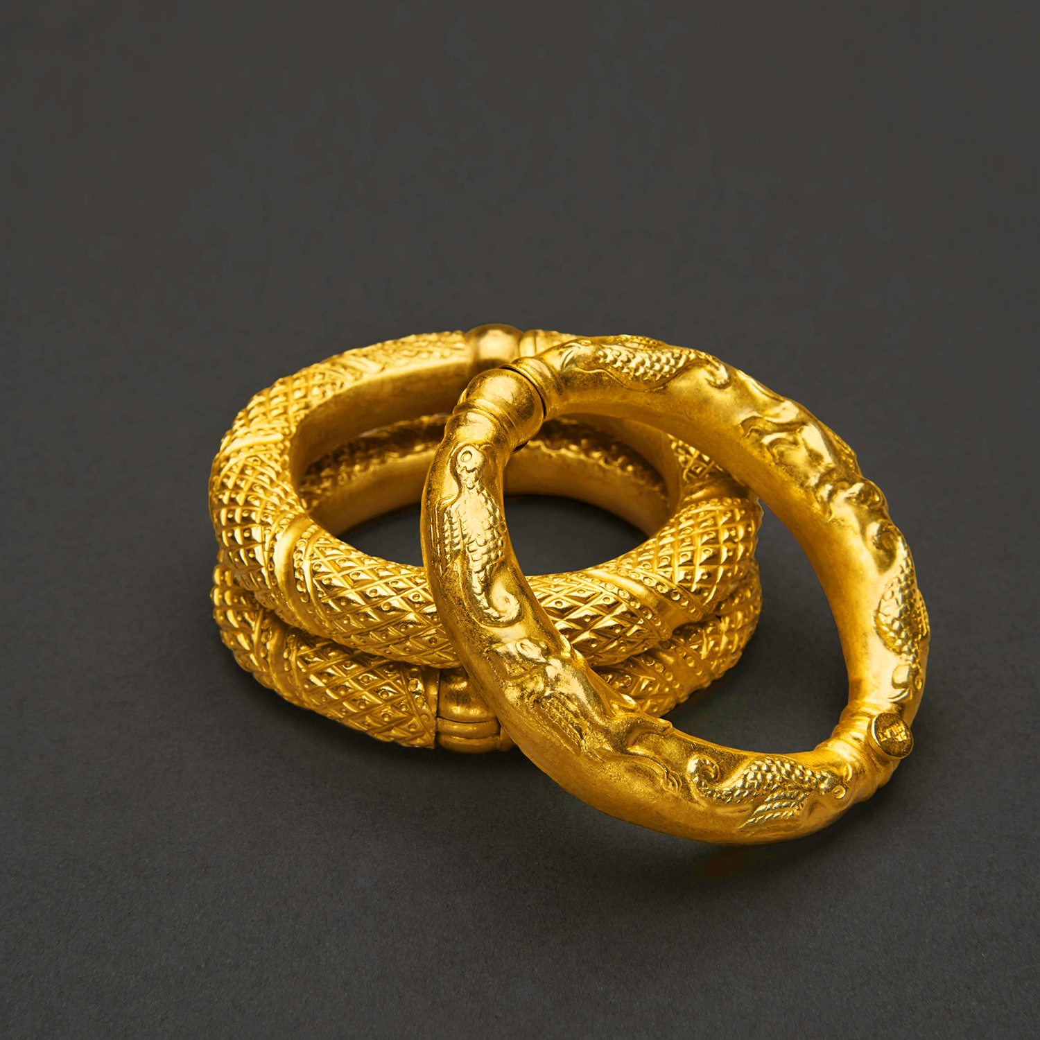 To create this exotic look, goldsmiths use a variety of ancient techniques to craft each piece and bring these brilliant 24 Karat gold bracelets together. Intricate designs and animal patterns are hand hammered and scored into the gold to add just the right amount of detail.