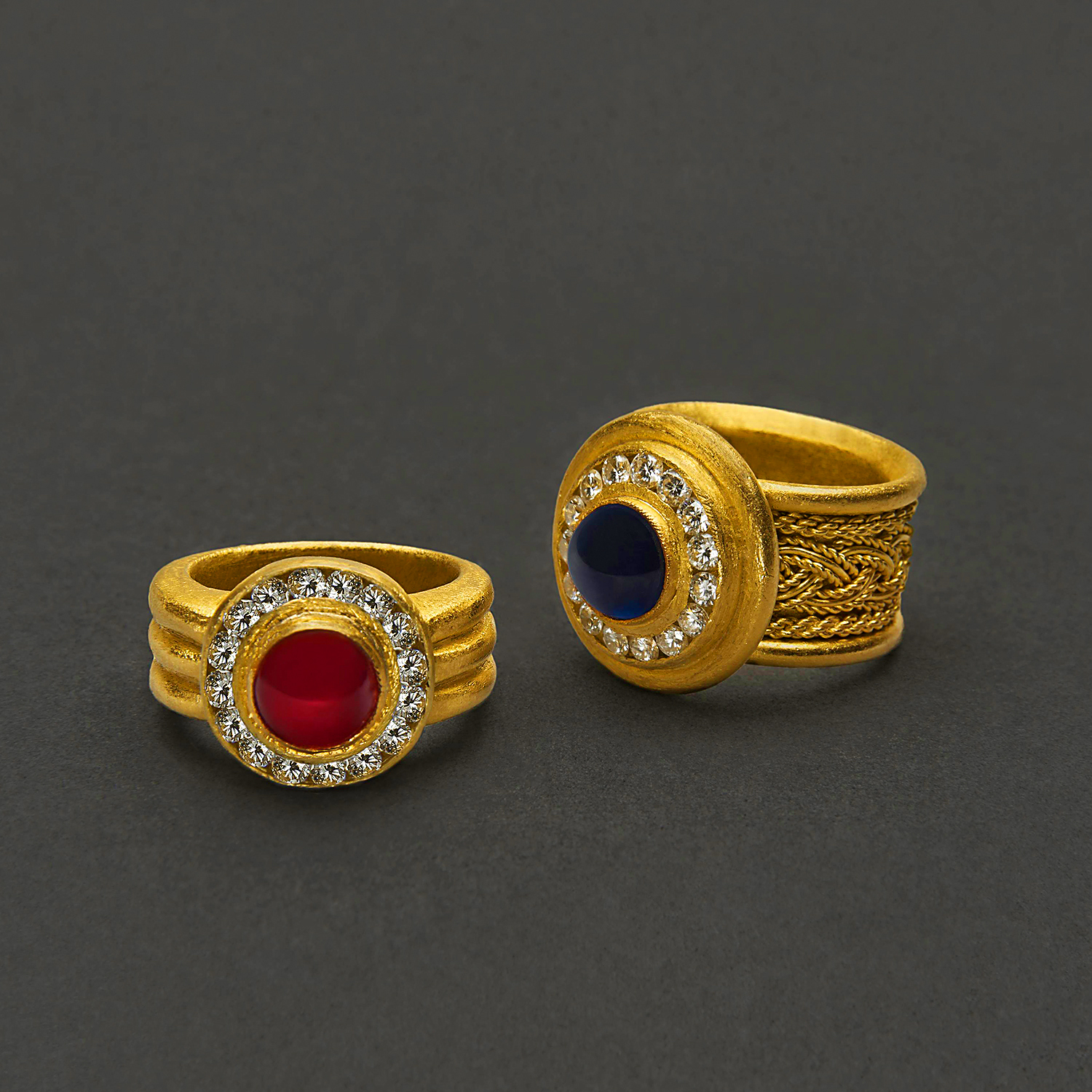 Hand cut pure gold is layered together to form these bold rings adorned with a precious center stone and surrounded with channel-set fine diamonds. Available in ruby or sapphire with a handwoven filigree chain embedded in the band.