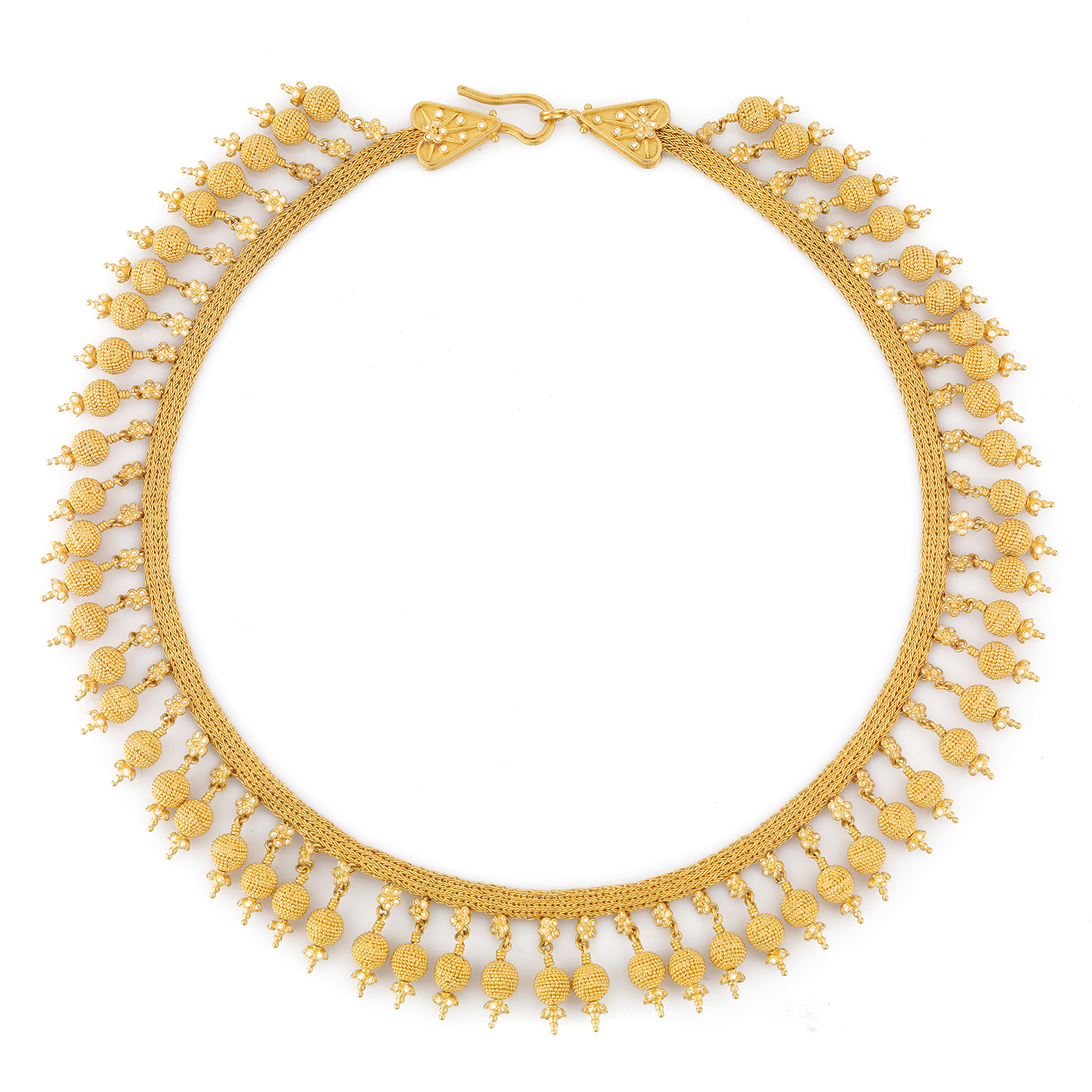 SPECIFICATION:Completely Handcrafted 24 Karat Pure Gold Hellenistic Necklace Decorated with Fringes Linked to Hand-Woven Chain.