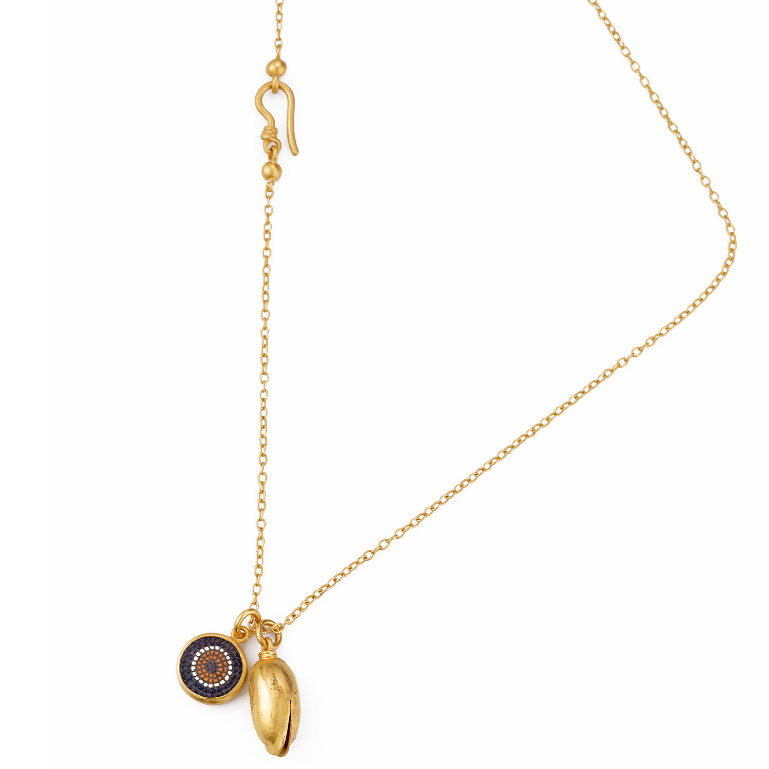 SPECIFICATION:Completely Handmade 24 Karat Pure Gold Pistachio Pendant and Micro Mosaic Evil Eye Pendant with its Hand-Woven Chain.