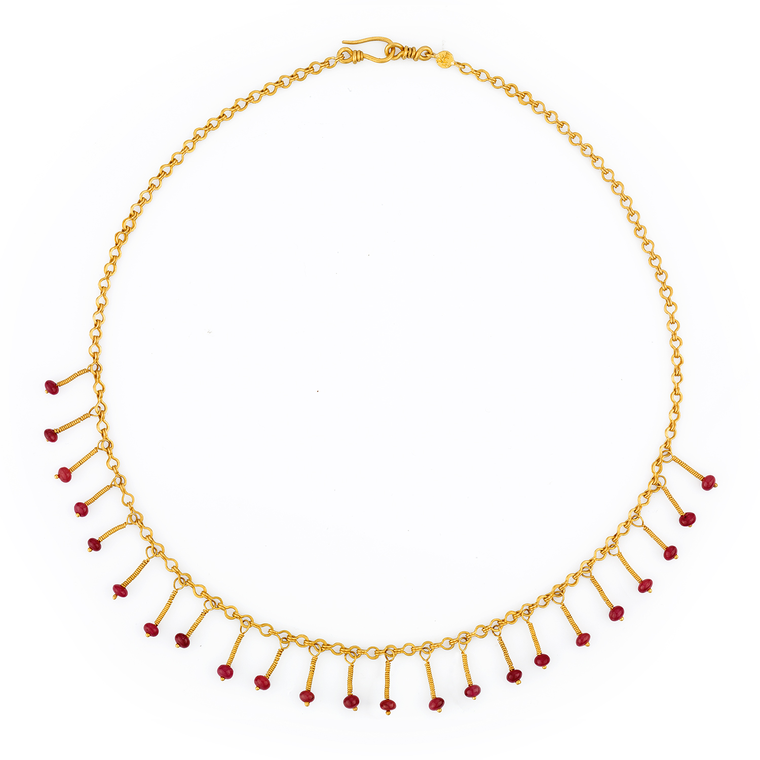 SPECIFICATION:Completely Handcrafted 24 Karat Pure Gold Fringed Necklace Decorated with Ancient Red Colored Beads Linked to its Single Hand-Woven Chain.