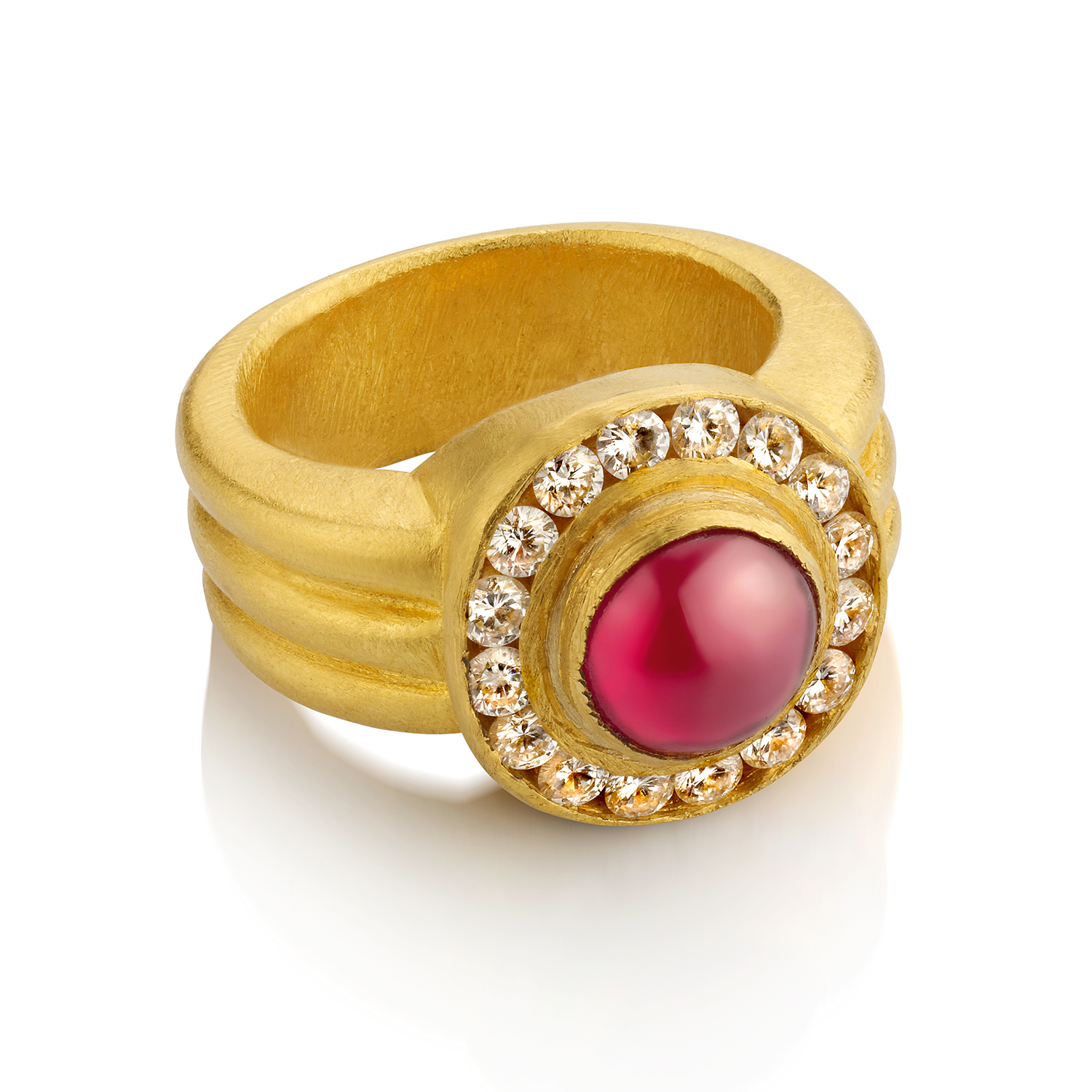 Completely Handmade 24 Karat Pure Gold Three Layered Ring Decorated with Fine Quality Ruby and Diamonds