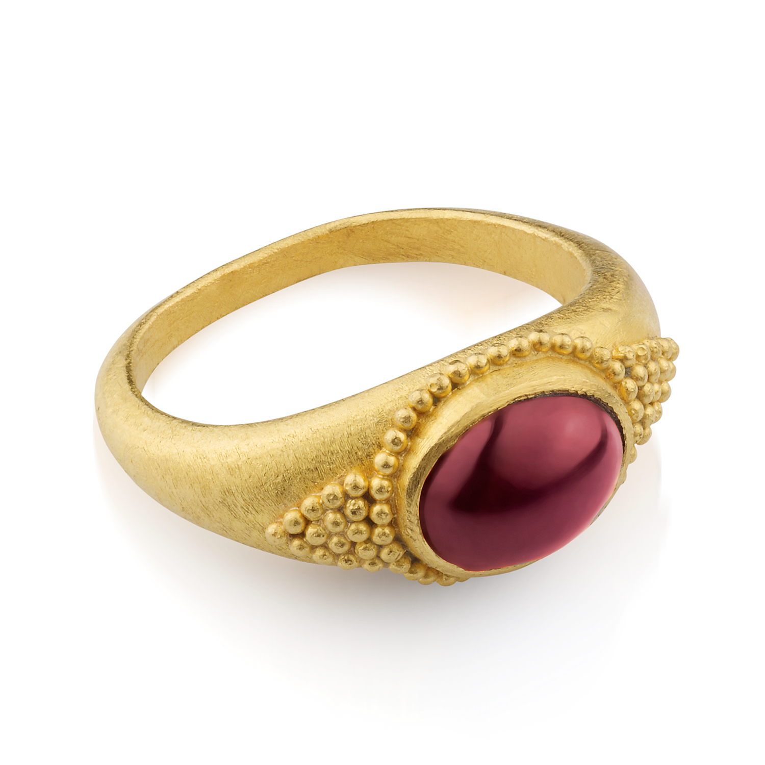 Completely Handmade 24 Karat Pure Gold Ring Decorated with Micro Granules and Fine Quality Ruby