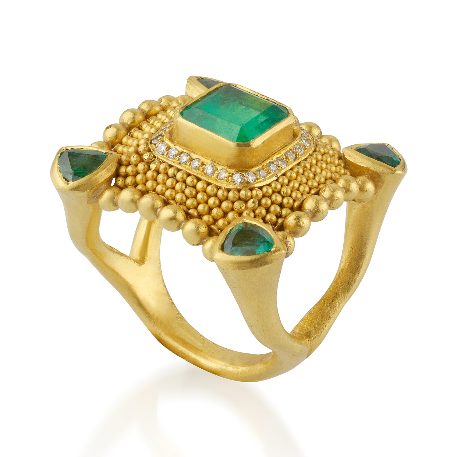 Completely Handmade 24 Karat Pure Gold Square Ring Decorated with Micro Granules and Fine Quality Emeralds